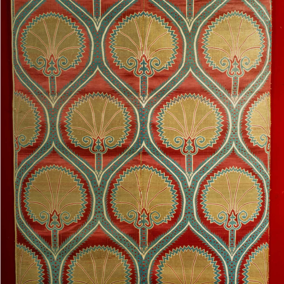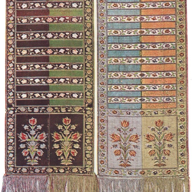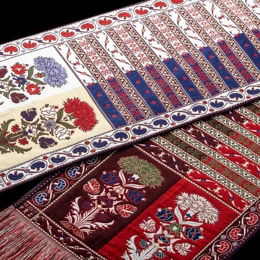 Hér að ofan má sjá altembas til vinstri og kamcha til hægri. Um er að ræða textíl sem ofinn er að hluta til með gullþræði. Altembas er töluvert grófara.