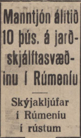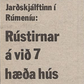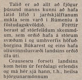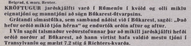 Jarðskjálftinn í Vrancea (fjallgarður í Rúmeníu mjög svo nálægt Búkarest) sem mældist 7.7 á Richter (reyndar á hinum svokallaða vægistærðarkvarða, sem hentar betur til að mæla stóra skjálfta en það heiti er þjálla en Richter, sem er ennþá notað af fjölmiðlum).