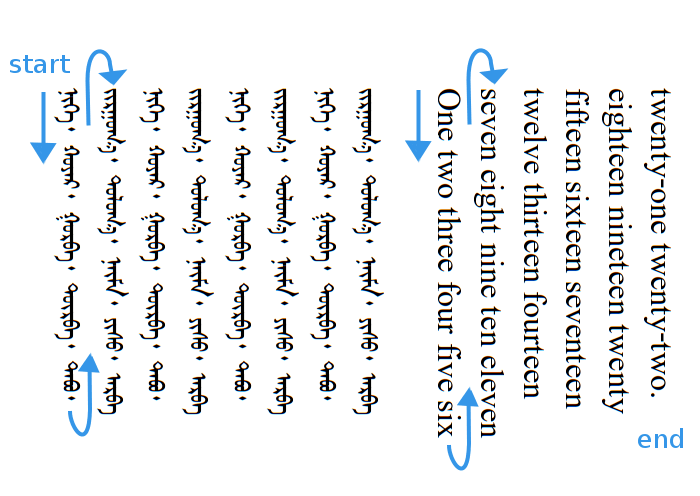 Mongólskt letur er sérstakt (fyrir okkur sem notum latneskt letur) að því leiti að það er skrifað að ofan og niður og síðan til hægri.
